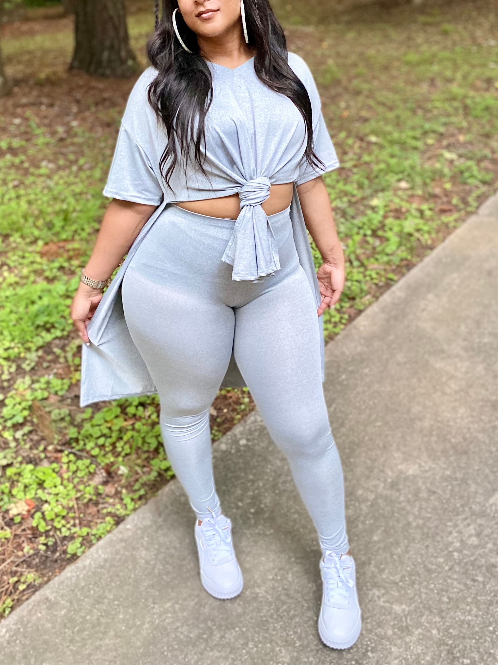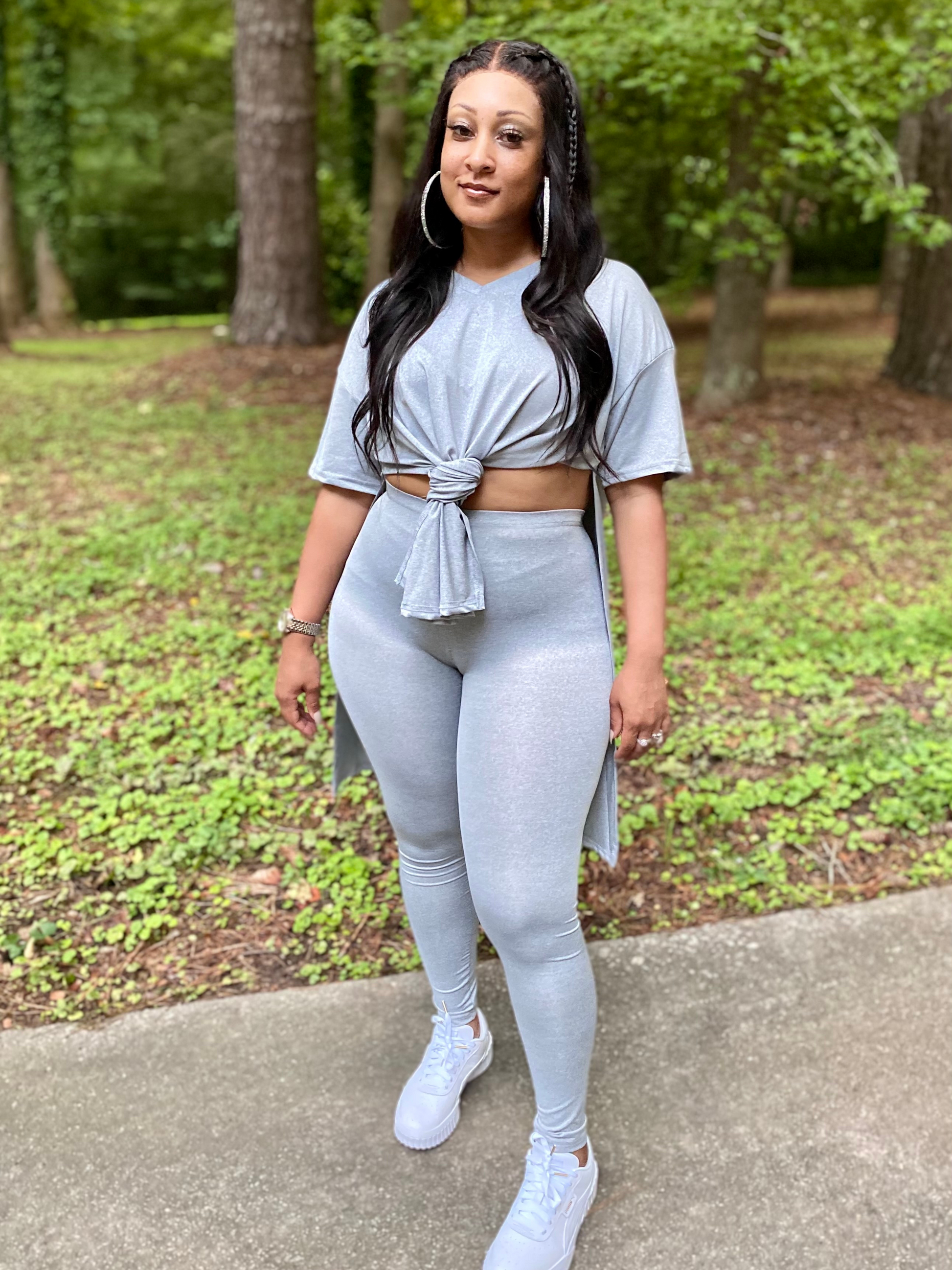 Silky Jersey V-Neck Side Slit Leggings Set. Made With 96% Polyester And 4% Spandex. Perfect Relaxed Fit Outfit For Those On The Go Days. Super Comfortable And The Top Is Versatile. It Can Be Worn Tied Up Into A High-Low Crop Top or Worn Loose To Display The Slits On Each Side. Model Is Wearing A Size Large.
